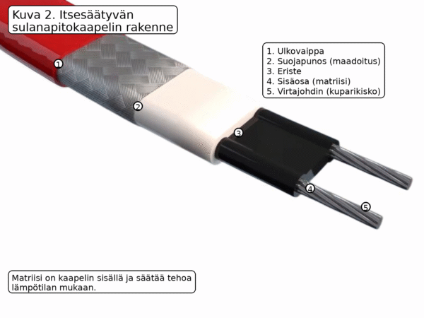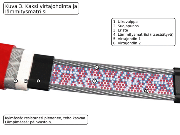 Tämä rakenne selittää myös, miksi kaapeli on “itsesäätyvä”: jännite kulkee kahden rinnakkaisen virtajohtimen kautta, ja lämmitys tapahtuu matriisissa niiden välissä. Näin kaapeli pystyy muuttamaan tehoa paikallisesti sen mukaan, millainen lämpötila juuri kyseisessä kohdassa on.