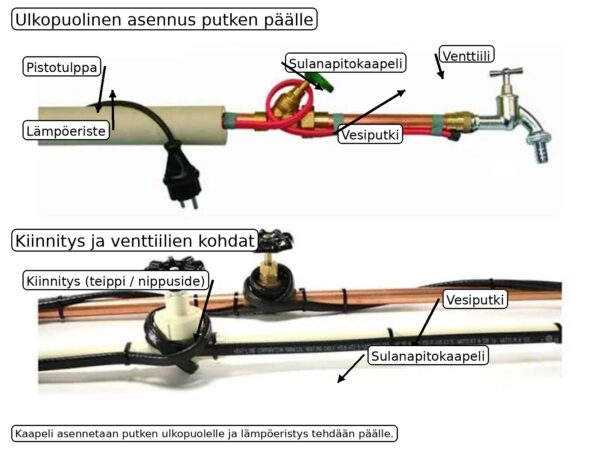 ulkopuolinen asennus putken päälle on yleisin ratkaisu, kaapeli kiinnitetään putkeen ja sen päälle tehdään lämpöeristys
