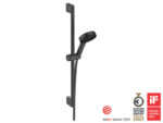 Sisältää: käsisuihku (⌀ 105 mm) kolmella suihkutilalla, suihkunostin 65 cm (⌀ 22 mm), suihkuletku kääntyvällä liitoksella (kartiomainen holkki molemmissa päissä), korkeussäädettävä liukusäädin (lukittavissa painikkeella, vasen/oikea kääntyvä).