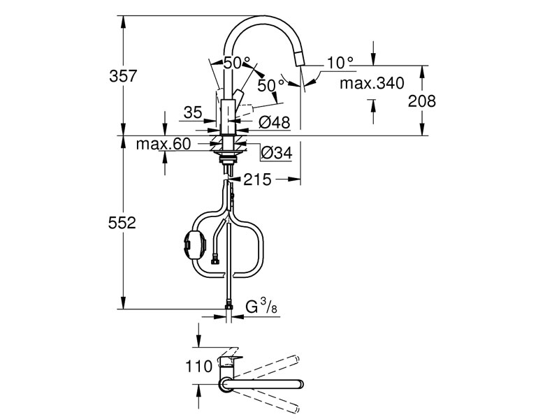 Korkea tila 360° kääntösäteellä ja sisäänvedettävällä suuttimella.