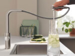 Grohe Blue Pure Minta SuperSteel harjattua terästä oleva keittiöhana ulosvedettävällä suuttimella.