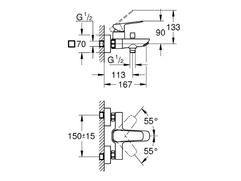 Asennusmitat: keskietäisyys 150 ± 15 mm.