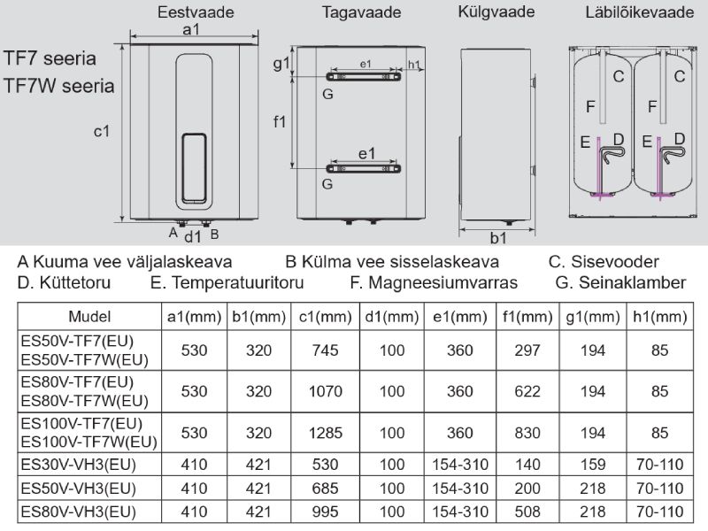 Haier ES100V-TF7W on 100 litran sähkökattila, jossa on elektroninen ohjaus ja WiFi-yhteys. Kattilan teho on 3000 W ja nimellispaine 8 bar. Kattila voidaan asentaa sekä pystysuoraan että vaakasuoraan. TF7W-sarja on suunniteltu käyttäjille, jotka haluavat kompaktin kattilan, mutta haluavat kätevää ohjausta ja lisätoimintoja. Kattilan käyttötiloja ja lämpötilaa voidaan ohjata elektronisesti, ja siinä on myös WiFi-ohjaus. Suunnittelussa on kaksoissäiliö (kaksisäiliöinen ratkaisu), joka on suunnattu tehokkuuteen ja kätevämpään käyttöön, ja lämmityselementin materiaali on titaani (Ti), joka on valittu pitkän käyttöiän ja kestävyyden takaamiseksi.