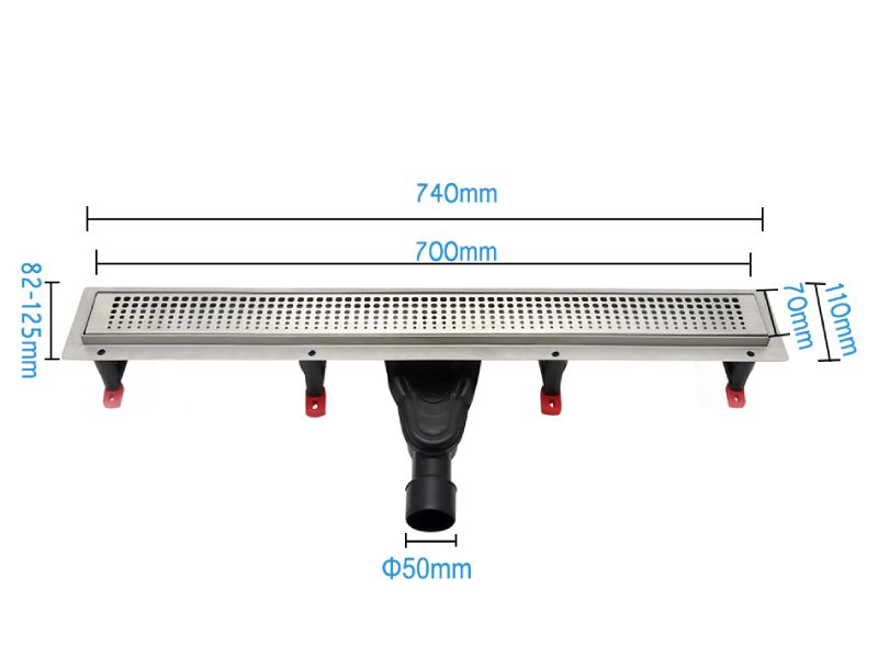 Säädettävät jalat: 4 paria jalkoja mahdollistavat lattiakaivon tarkan tasauksen.