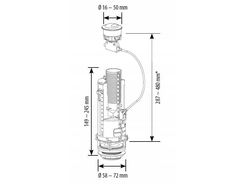 Korkeus säädettävissä 272-482 mm, kannen aukko 16-50 mm, ulostuloaukko 58-72 mm.
