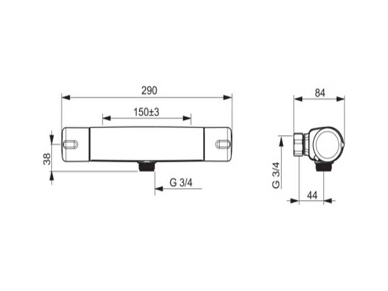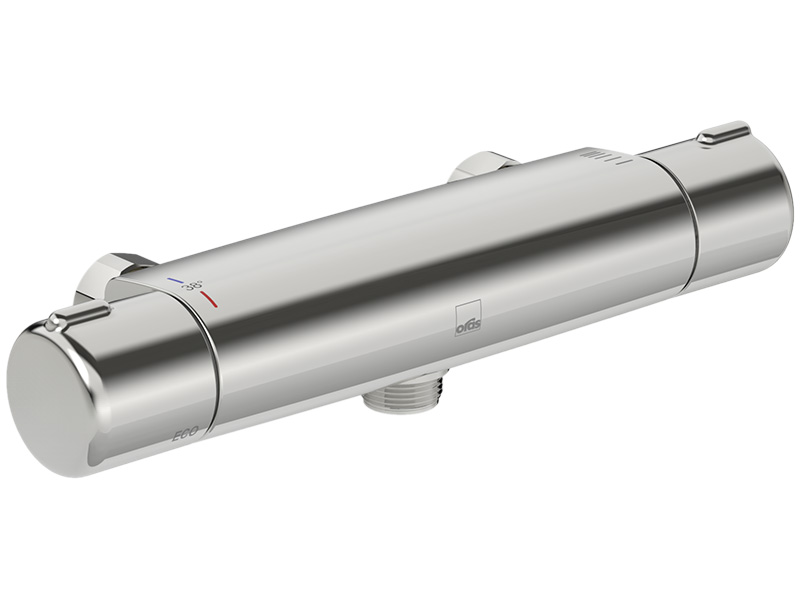 Suihkusekoitin termostaatilla. Lämpötilan säätökahva turvarajalla (38°C). EcoFlow-vesivirtauksen säätö. Takaiskuventtiilit. Jätevesilukot. HUOM: Kuuma vesi oikealta, kylmä vesi vasemmalta!