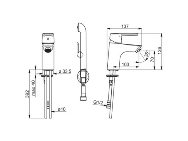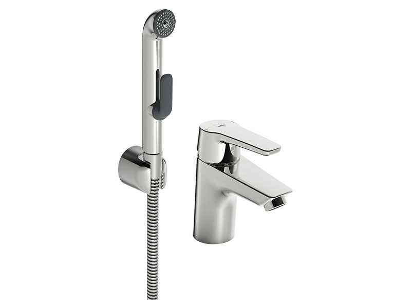 Jäykkä suihkuputki, lämpötilan ja virtausnopeuden säätö, Bidetta-käsisuihku, 1,5m suihkuletku, seinäkiinnike. Vedenvirtausraja 6,0 l/min.