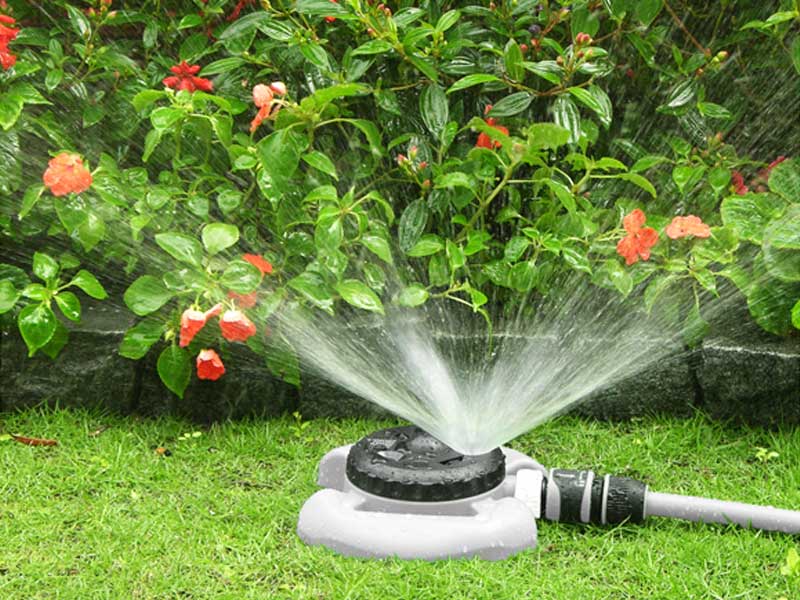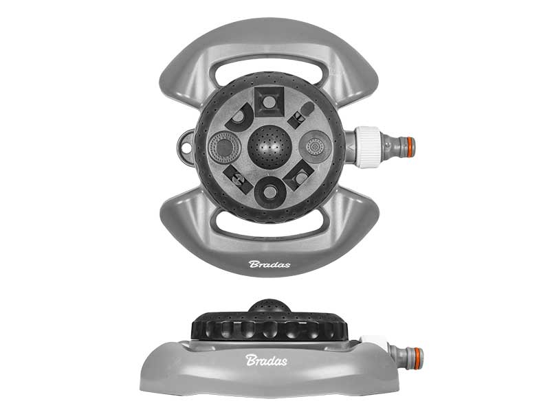 Bradas WL-Z15 8-toiminen staattinen sprinkleri (kastelualueen halkaisija 14 m.) on asennettu tukevalle muovijalustalle, joka takaa maksimaalisen vakauden eikä vahingoita nurmikkoa.
