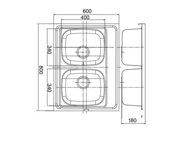Ruostumaton satiinikiillotettu pesuallas, jossa on yliasennettu DUN 80,0 x 60,0cm , oikeanpuoleisella pesualtaalla.