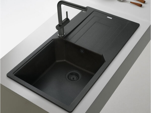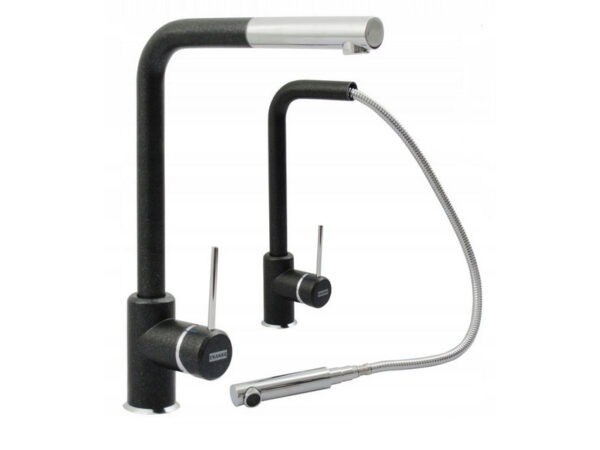 Franke Sirius L Onyx keittiöhana ulosvedettävällä suihkukaukalolla.