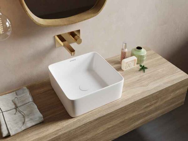 Päälle asennettava keraaminen pesuallas Sofia matta valkoinen 38,5 x 38,5 x 14cm.