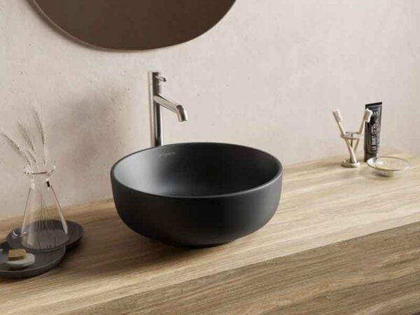 Päälle asennettava musta keraaminen allas Alma 39 x 32,5 x 14cm.
