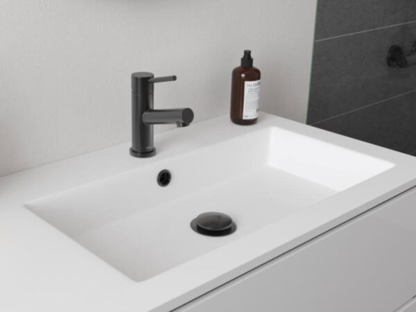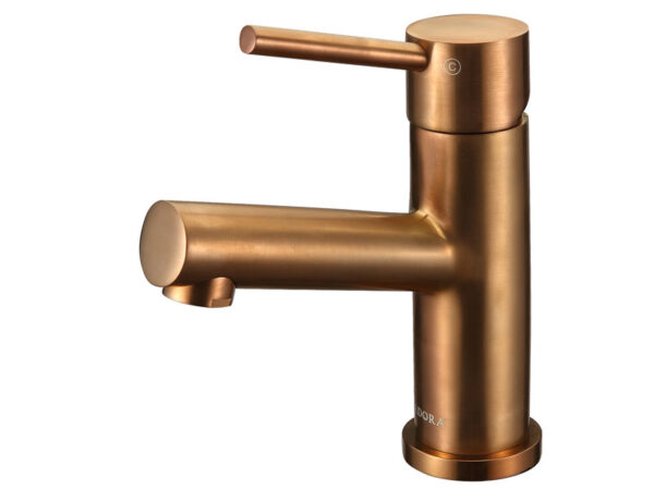 Harjattu ruusukultainen pesualtaiden sekoittaja Adora Imperia Rose Gold Brushed pop-up pohjaläpiviennillä.