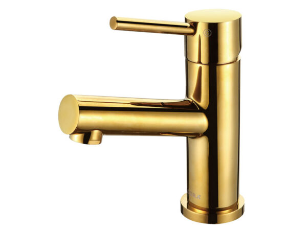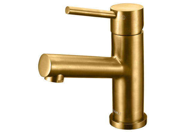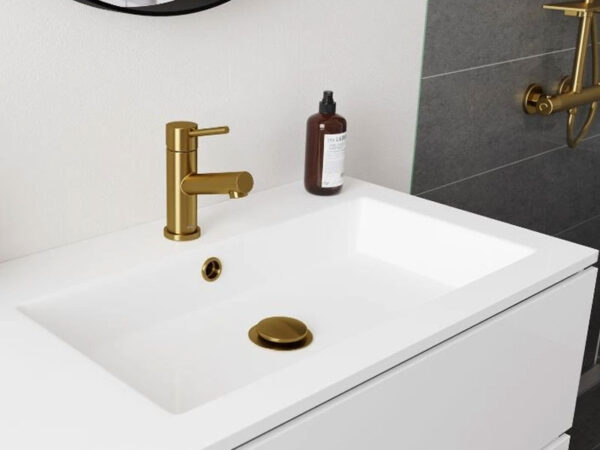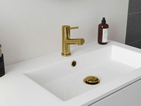 Harjattu kultainen pesualtaan sekoittaja Adora Imperia Gold Brushed pop-up pohjaventtiilillä.