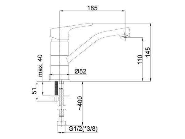Suihkusekoitin Rubineta UNO-10/K lyhyellä juoksevalla vesijohdolla.