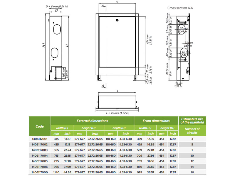 KAN-therm SPE-6 lattialämmityksen keräinkaappi, seinälle asennettava, 1140 x 577-677 x 110-160 mm, 16-piirikeräimelle
