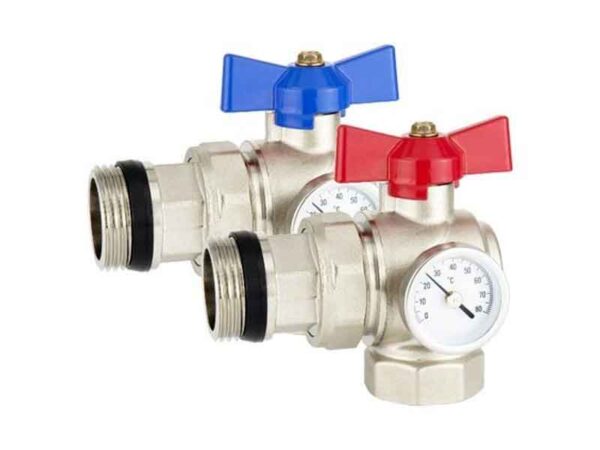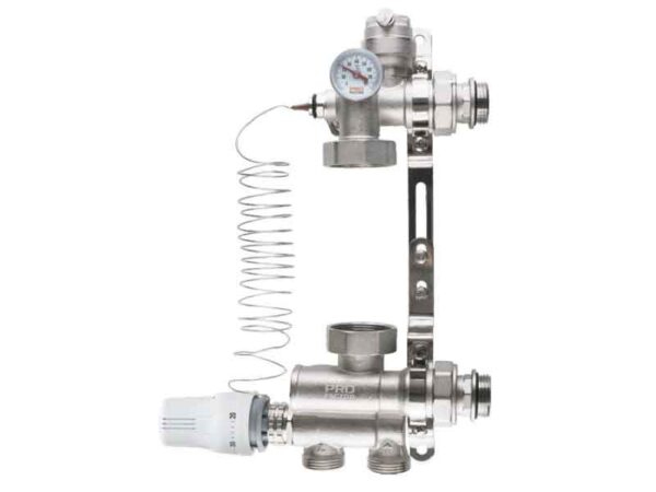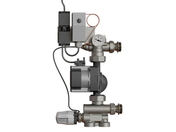 Barber-pumppuryhmä lattialämmityskanavaan, jossa on termostaattiventtiili.