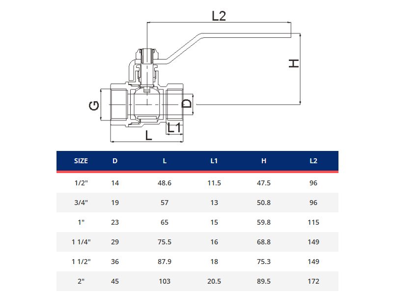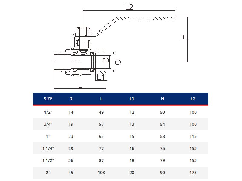 kaasun palloventtiili pitkällä kahvalla, sisäinen ulkokierre 1/2