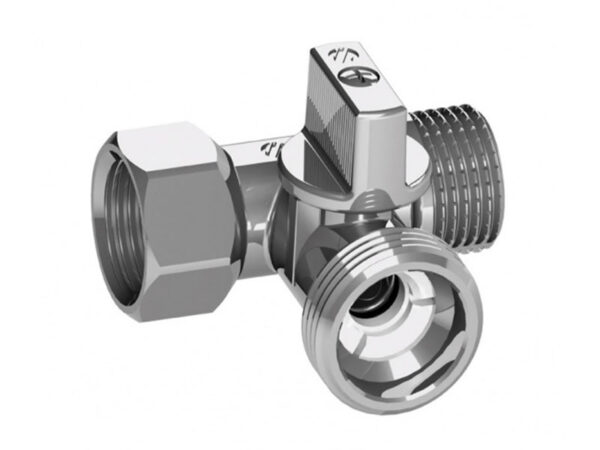 THS-kulmahana, jossa on messinkiset ulkokierteet 1/2″ -1/2″ venttiili metallikahvalla.