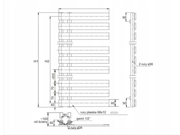 pyyhekuivain lämminvesivaraajalle SNELLO 500x1200mm antrasiitti.